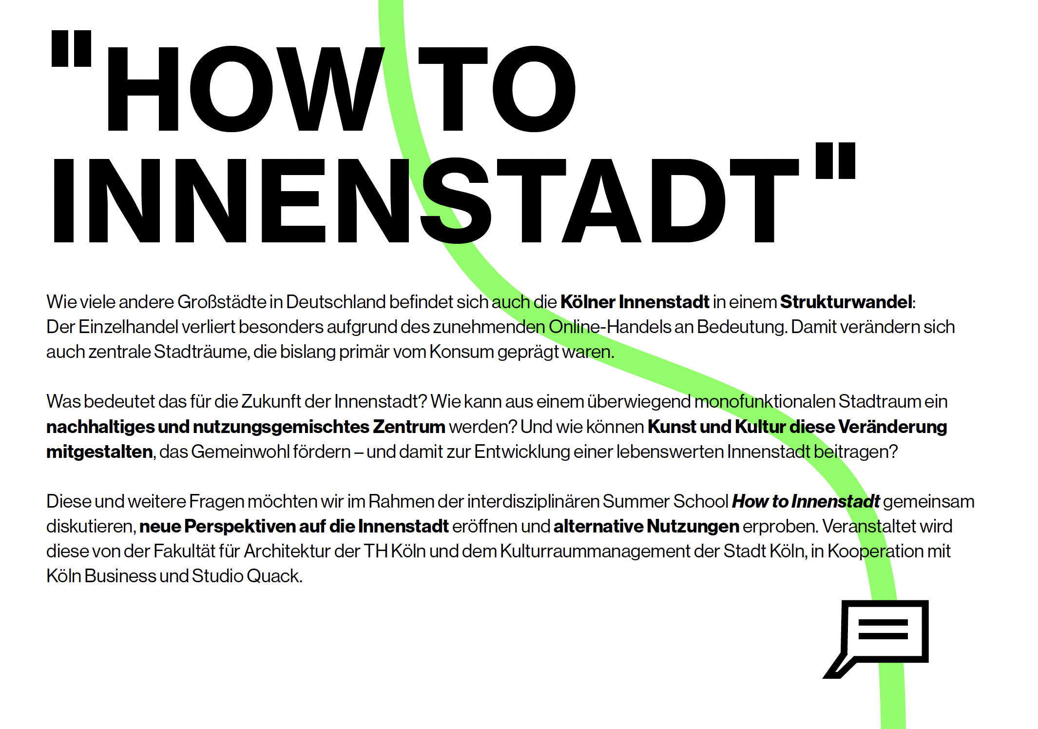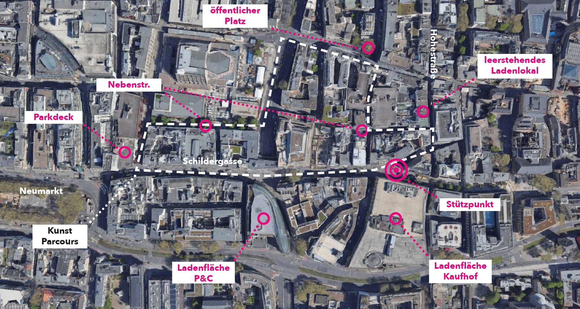 Der Strukturwandel im Einzelhandel setzt die traditionell auf Gewerbe und Handel ausgerichteten urbanen Räume in den Innenstädten unter Druck – dies lässt sich auch in den zentralen Kölner Handelslagen beobachten und führt zu einer steigenden Zahl von Leerständen und Mindernutzungen, die nicht nur Ladenlokale, sondern auch angrenzende Infrastrukturen wie Parkhäuser oder obere Verkaufsetagen betreffen. Dies wirft Fragen auf: Welche kohärenten Sekundärnutzungen sind erforderlich, um die Attraktivität dieser zentralen urbanen Räume zu steigern? Welche Möglichkeiten der Mehrfachnutzung ergeben sich? Wie können kommerzialisierte Zwischenräume und öffentliche Räume sinnvoll genutzt werden? Kulturelle und künstlerische Aktivitäten sind unbestreitbar von großer Bedeutung für die Belebung von Stadträumen und schaffen Treffpunkte in einer sich zunehmend entfremdenden Gesellschaft. Die zentrale Forschungsfrage ist daher, welche Rolle die Kultur in Form von kultureller Zwischennutzung bzw. Pioniernutzung in der Transformation von Innenstädten spielen kann.